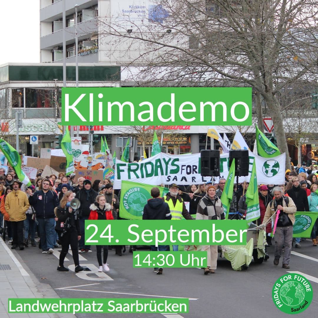 Am 24. September, also zwei Tage vor der Bundestagswahl, um 14:30 Uhr findet der bereits 8. Globale Klimastreik auch hier im Saarland statt. Unter dem Motto #AlleFürsKlima gehen wir wieder gemeinsam auf die Straße, um für eine bessere Welt und für Klimagerechtigkeit zu kämpfen.