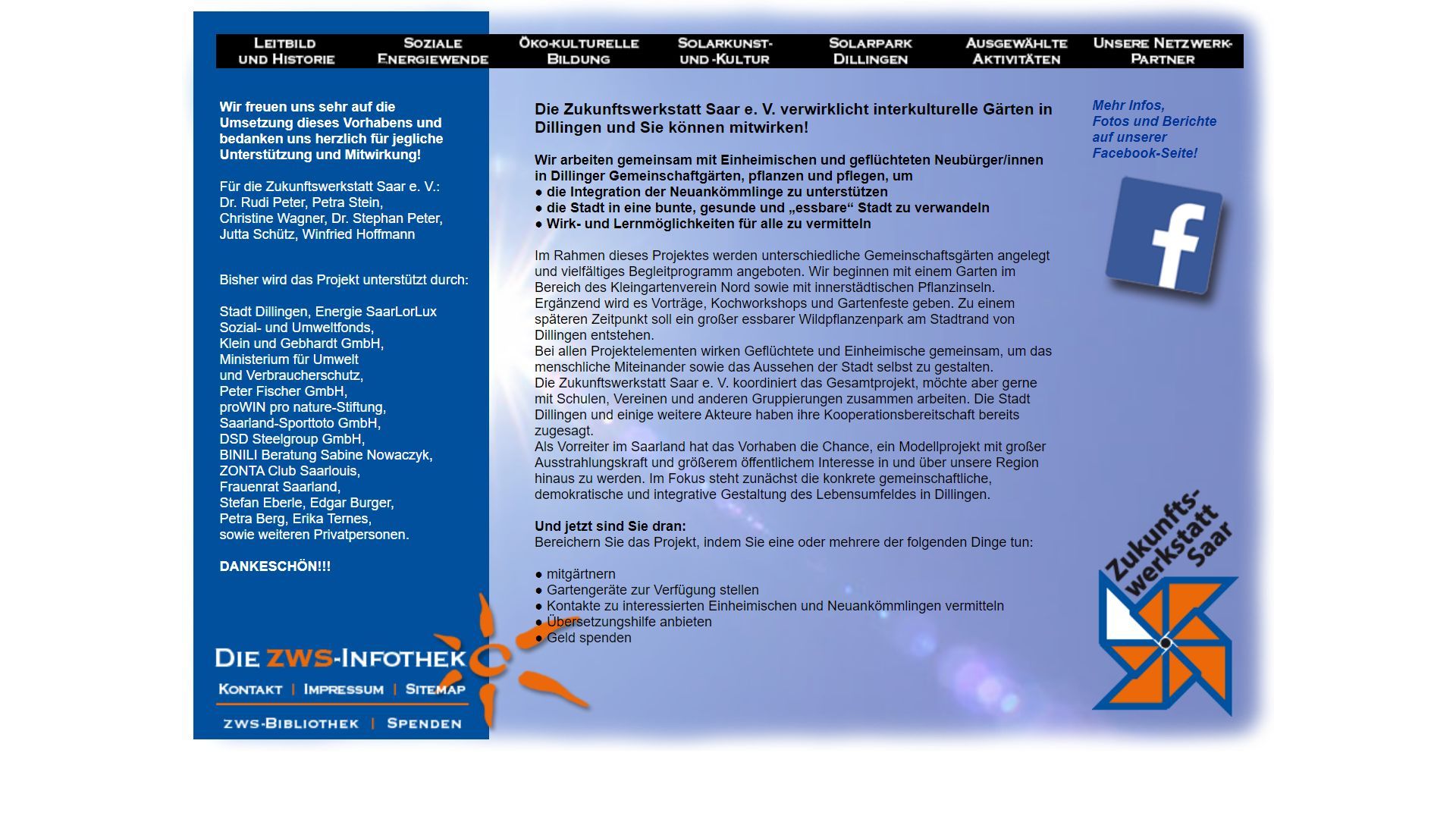 Die Zukunftswerkstatt Saar e. V. koordiniert das Gesamtprojekt, möchte aber gerne mit Schulen, Vereinen und anderen Gruppierungen zusammen arbeiten. Die Stadt Dillingen und einige weitere Akteure haben ihre Kooperationsbereitschaft bereits zugesagt.