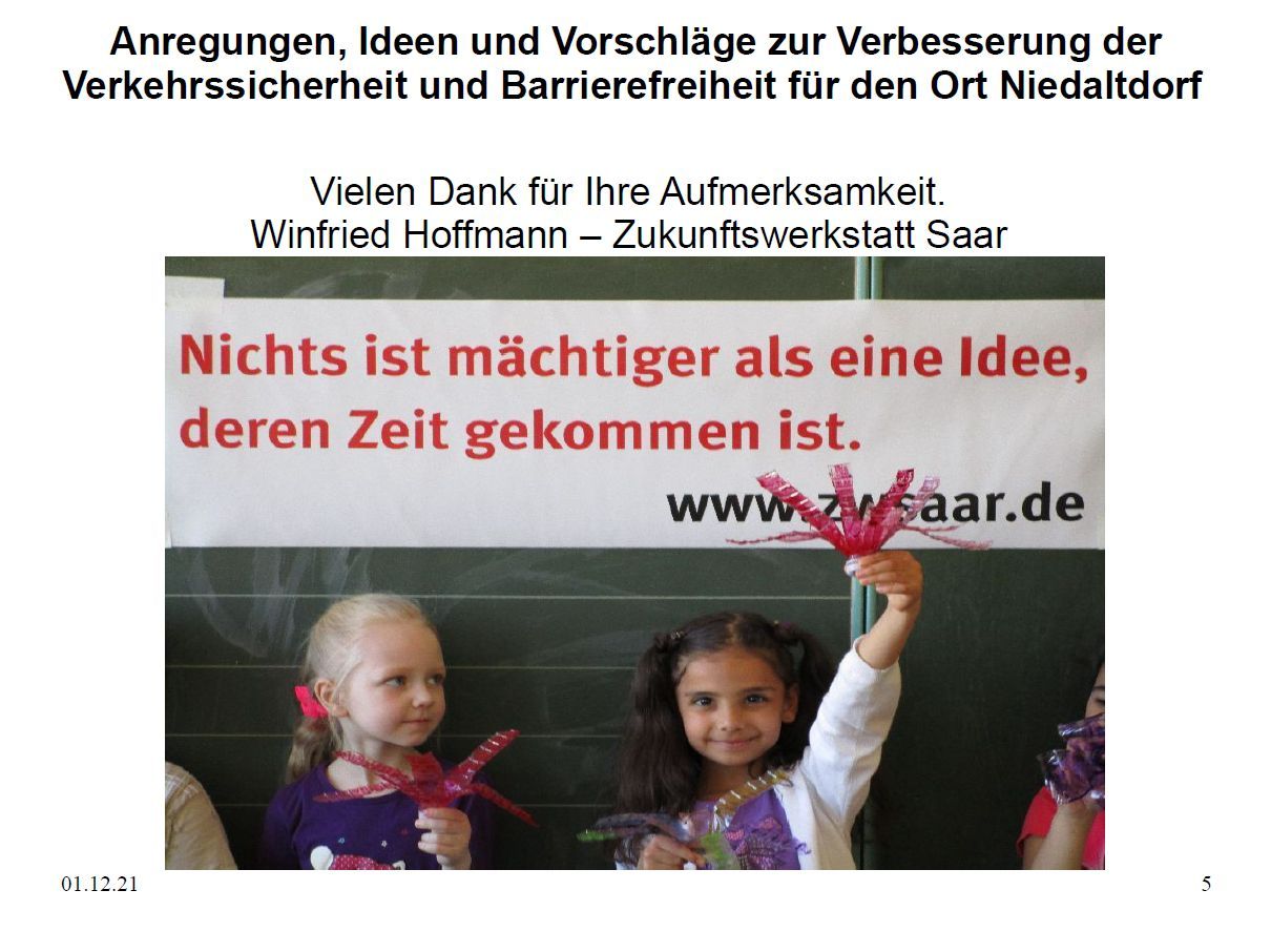 Am 2.Dezember 2021 fand eine Ortsratssitzung zwecks Vorstellung von Innovationen zur barrierefreieren Verbesserung der Bürgersteige und den Umbau eines alten Spielplatzes zu einem inklusiven Ort der Begegnung in Niedaltdorf statt.