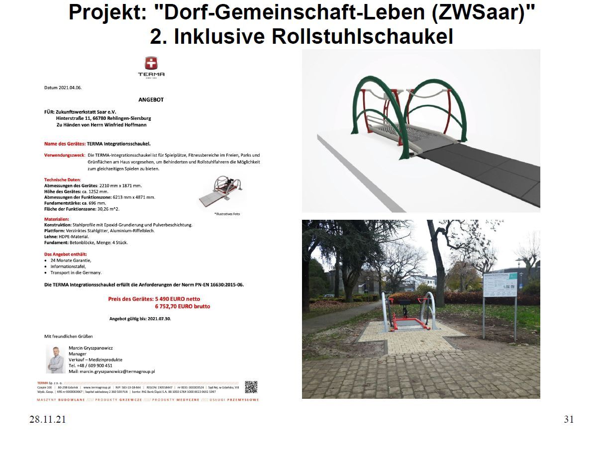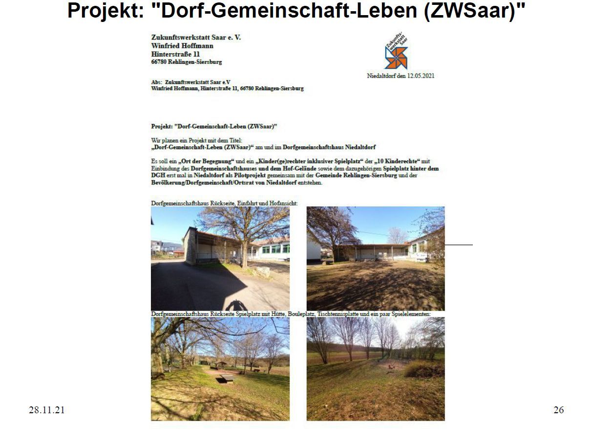 Projekt „Dorf-Gemeinschaft-Leben“ mit inklusivem Spielplatz am Dorfgemeinschaftshaus in Niedaltdorf wurden von mir den anwesenden Ortsratsmitgliedern per Video-Präsentation vorgestellt, als Dateien zur Verfügung gestellt und eingereicht.