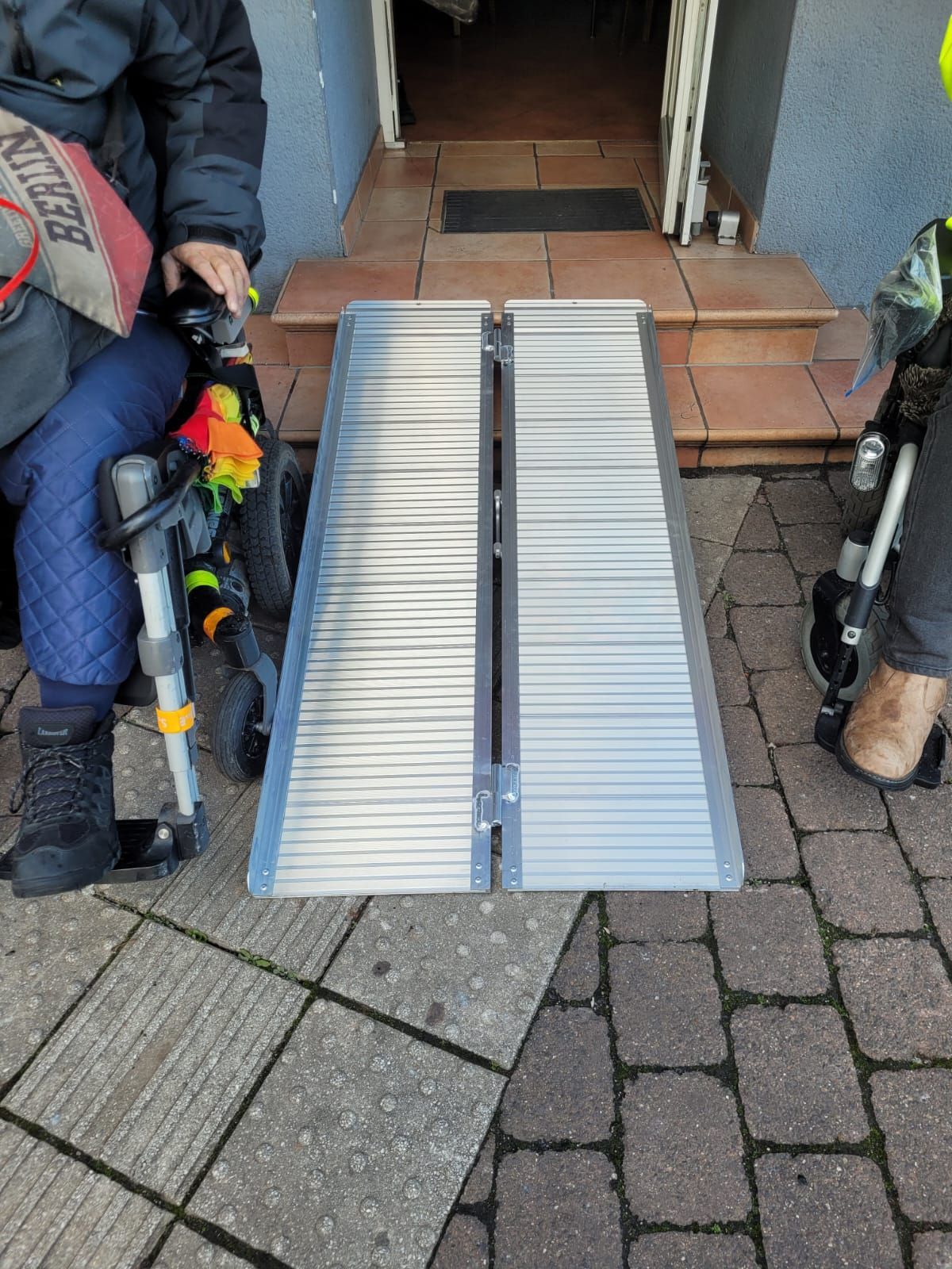 Wir boten der Inhaberin eine Wheelramp aus unserem Projekt Barrierefreieres Leben (ZWSaar) für auf unbestimmte Zeit an, damit sie in Zukunft bei Bedarf diese Rollstuhlrampe auslegen kann.