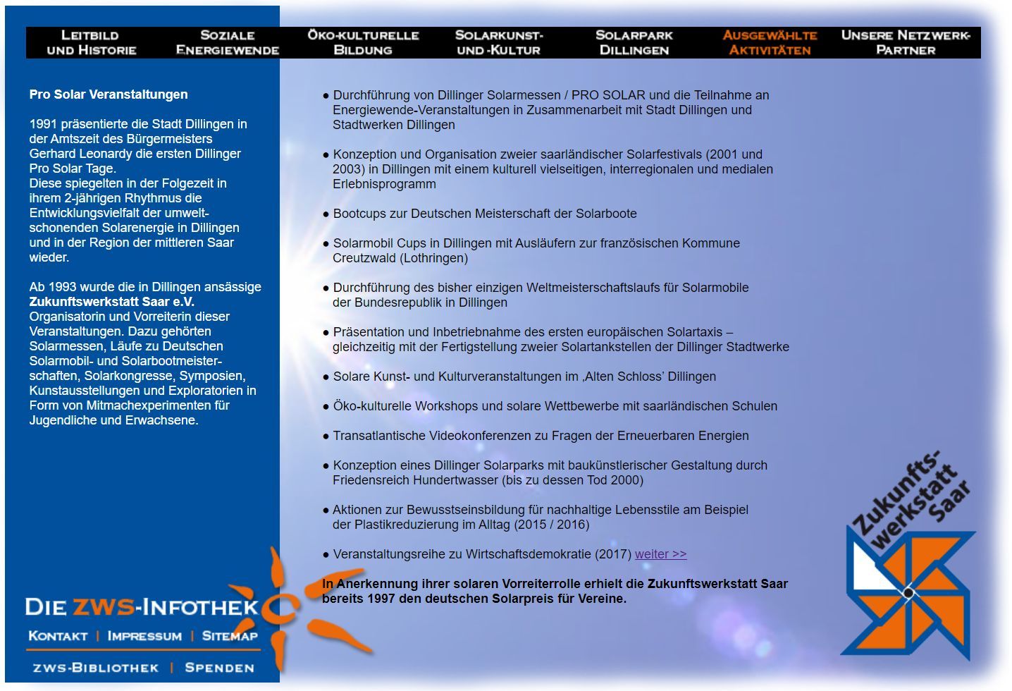 Ab 1993 wurde die in Dillingen ansässige Zukunftswerkstatt Saar e.V. Organisatorin und Vorreiterin dieser Veranstaltungen. Dazu gehörten Solarmessen, Läufe zu Deutschen Solarmobil- und Solarbootmeister-schaften, Solarkongresse, Symposien, Kunstausstellungen und Exploratorien in Form von Mitmachexperimenten für Jugendliche und Erwachsene..