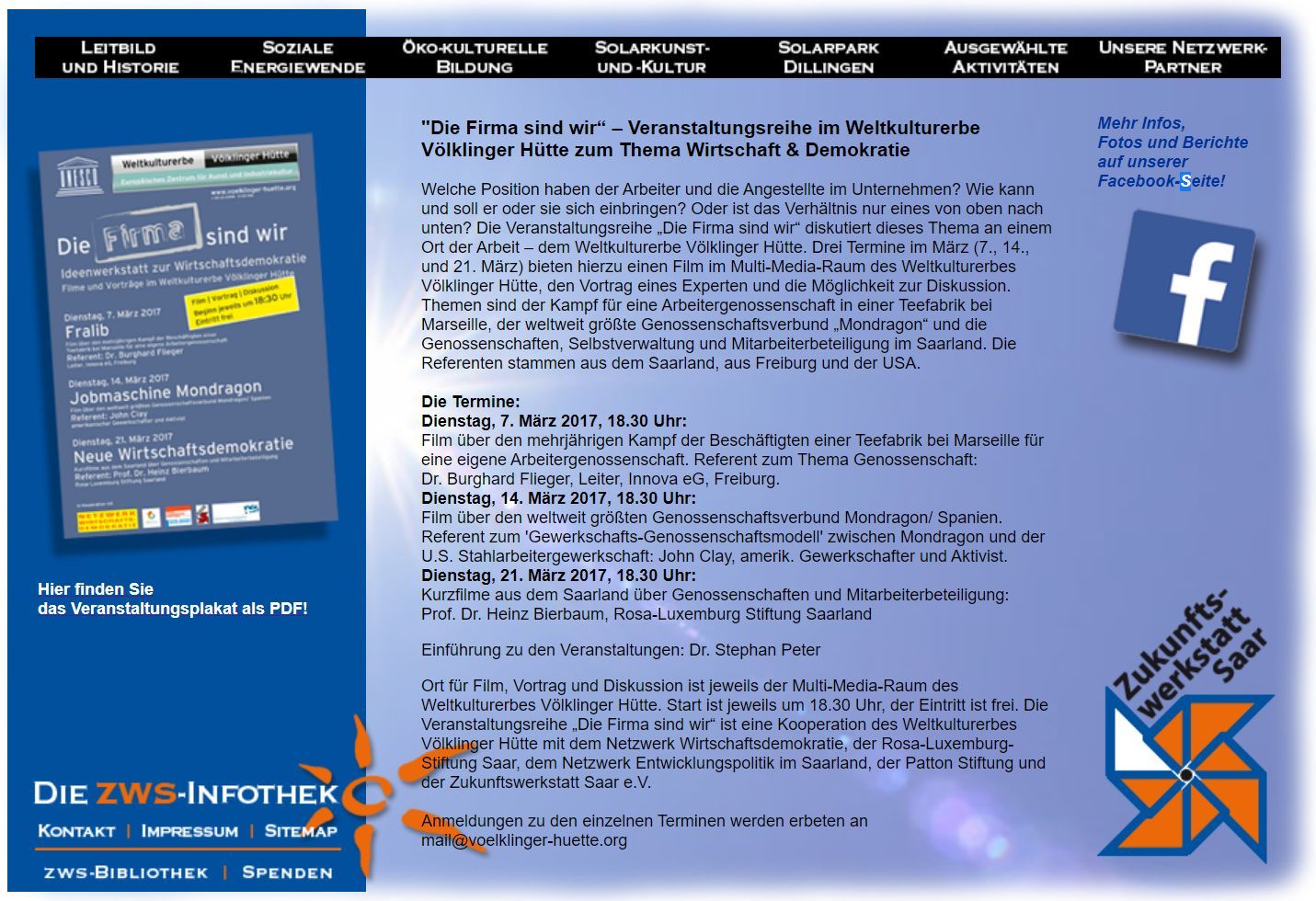 Ort für Film, Vortrag und Diskussion ist jeweils der Multi-Media-Raum des Weltkulturerbes Völklinger Hütte. Start ist jeweils um 18.30 Uhr, der Eintritt ist frei. Die Veranstaltungsreihe „Die Firma sind wir“ ist eine Kooperation des Weltkulturerbes Völklinger Hütte mit dem Netzwerk Wirtschaftsdemokratie, der Rosa-Luxemburg-Stiftung Saar, dem Netzwerk Entwicklungspolitik im Saarland, der Patton Stiftung und der Zukunftswerkstatt Saar e.V.