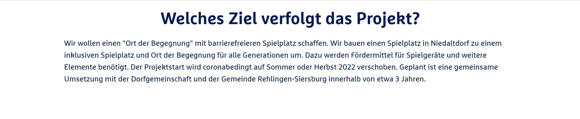 Am 2.Dezember 2021 fand eine Ortsratssitzung zwecks Vorstellung von Innovationen zur barrierefreieren Verbesserung der Bürgersteige und den Umbau eines alten Spielplatzes zu einem inklusiven Ort der Begegnung in Niedaltdorf statt.