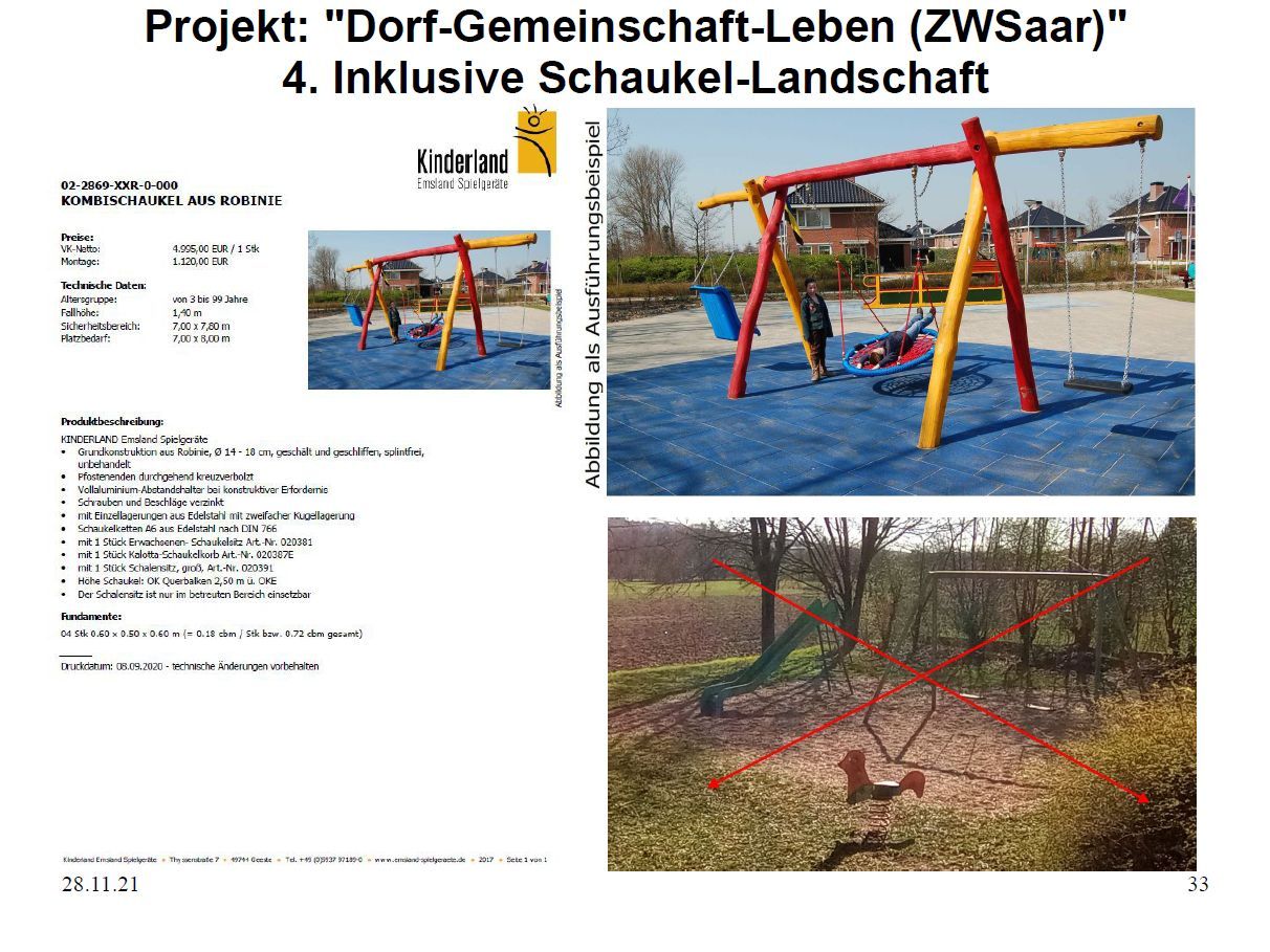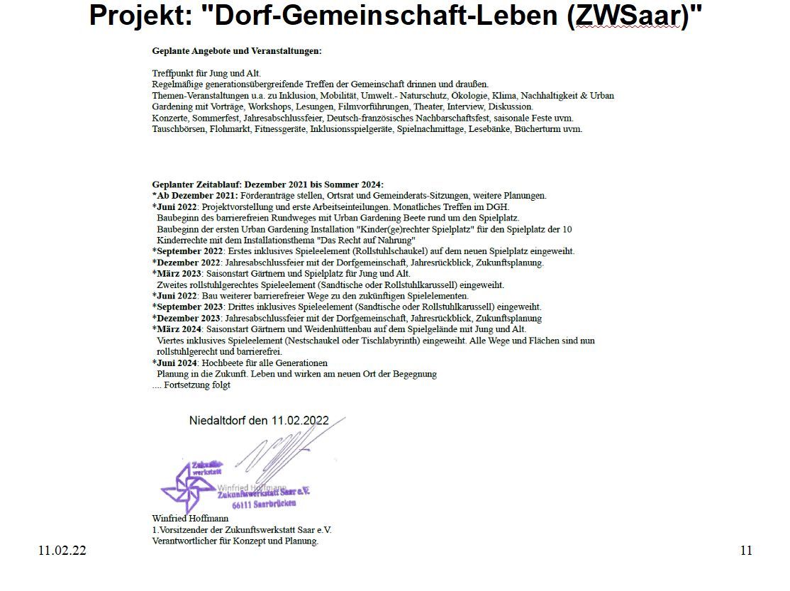Projekt „Dorf-Gemeinschaft-Leben“ mit inklusivem Spielplatz am Dorfgemeinschaftshaus in Niedaltdorf wurden von mir den anwesenden Ortsratsmitgliedern per Video-Präsentation vorgestellt, als Dateien zur Verfügung gestellt und eingereicht.