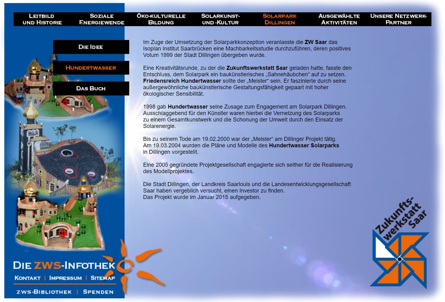 1998 gab Hundertwasser seine Zusage zum Engagement am Solarpark Dillingen. Ausschlaggebend für den Künstler waren hierbei die Vernetzung des Solarparks