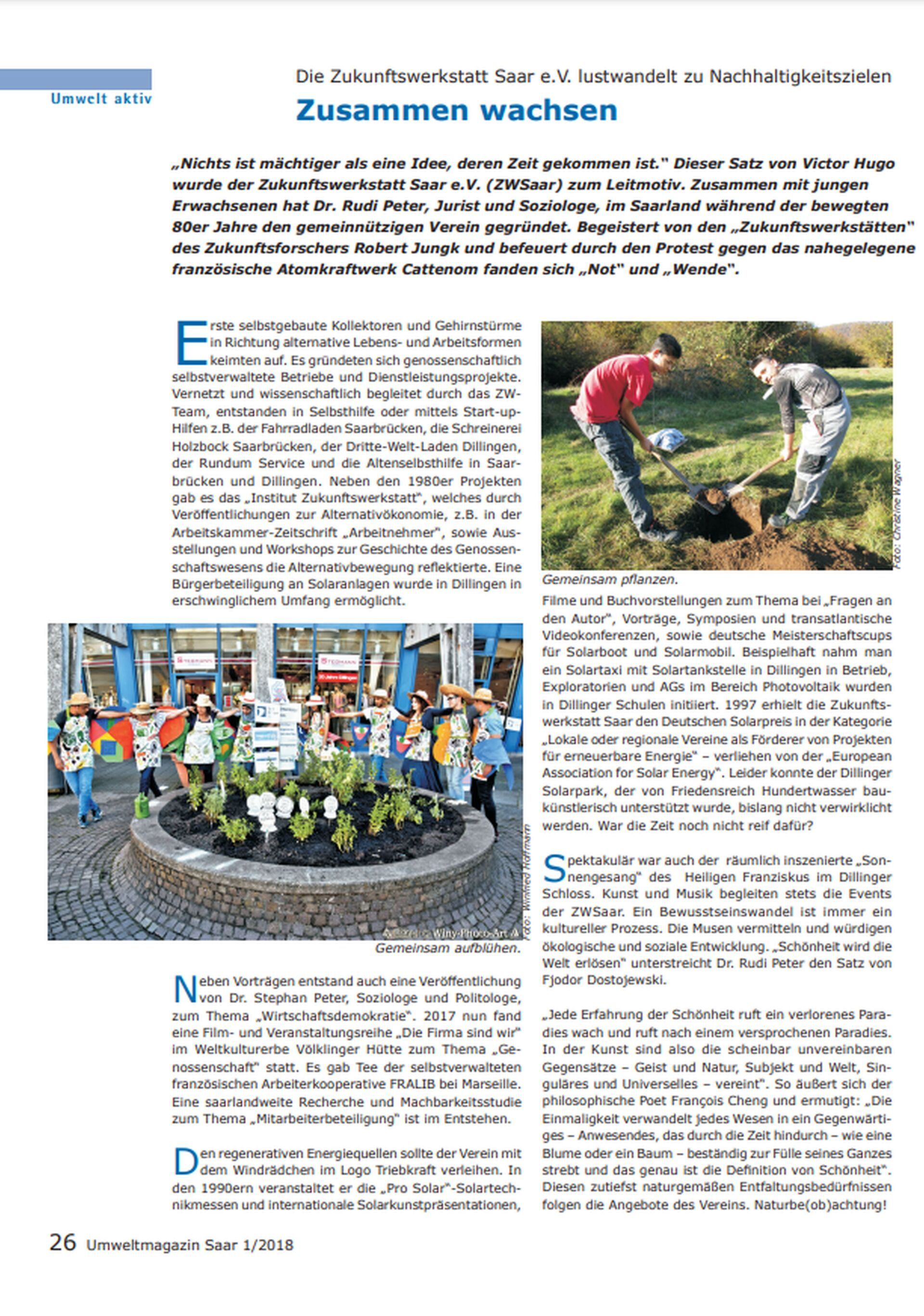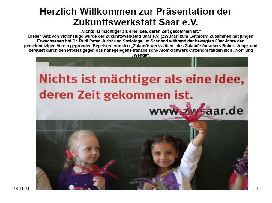 „Nichts ist mächtiger als eine Idee, deren Zeit gekommen ist.“ Dieser Satz von Victor Hugo wurde der Zukunftswerkstatt Saar e.V. (ZWSaar) zum Leitmotiv. Zusammen mit jungen Erwachsenen hat Dr. Rudi Peter, Jurist und Soziologe, im Saarland während der bewegten 80er Jahre den gemeinnützigen Verein gegründet. Begeistert von den „Zukunftswerkstätten“ des Zukunftsforschers Robert Jungk und befeuert durch den Protest gegen das nahegelegene